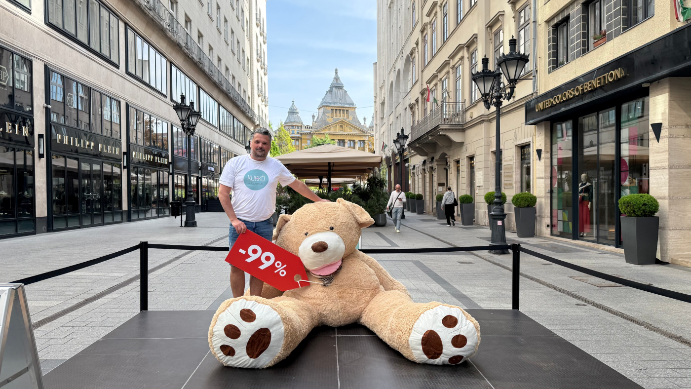 Gigantikus gyermekjátékkal találkozhat az, aki ma a budapesti Fashion Street környékén jár, amelyen egy 99%-os árengedményt sugalló címke is látható. A mackót valójában nem lehet megvásárolni és hazavinni, viszont még az árának egy százalékát sem kell kifizetnie annak, aki szeretné, hogy – racionális méretű és értékű, – sporteszközök és élmények tegyék szebbé a gyermekotthon lakóinak életét.